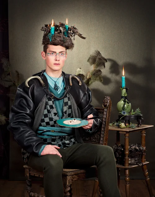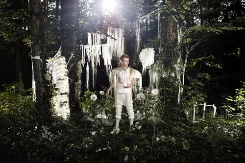 In a situation staged to the smallest detail, friendly, confident, open and enlightened community workers explain the philosophy of liberation from over-abundance. For a donation, one can acquire ‘enlightenment to-go’ and, as a climax, enter the chapel which is crowned with the glowing community symbol to honour and worship the angel Orchard, who promises absolute bliss and freedom. She appears in the large format of a perfectly lit photograph. On the front wall of the installation are grouped sixteen more staged figures of the community, arranged symmetrically and by size around the central portraits of the founding couple of this fictitious congregation. Using all sorts of symbolism and allegorical allusions, Konstanze Habermann skilfully combines the protagonists in her staged photographs employing the iconography, as supposedly typically accepted, of religiosity, mysticism and the sacred. Earthy muted colours, shimmering make-up as well as spotlights and highlights give the subject the perfect setting.
